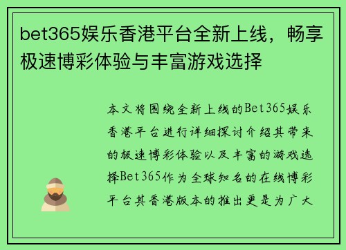本文将围绕全新上线的Bet365娱乐香港平台进行详细探讨,介绍其带来的极速博彩体验以及丰富的游戏选择。Bet365作为全球知名的在线博彩平台,其香港版本的推出,更是为广大玩家提供了更加优质的娱乐体验。本文将从四个方面进行详细分析,分别是平台的极速体验、游戏种类的丰富性、用户界面的优化以及安全保障措施。每一方面都将深入探讨其独特优势,并解释为何这一平台在市场上迅速占据一席之地。最终,本文将通过总结归纳,展示Bet365香港平台全新上线的意义和影响。