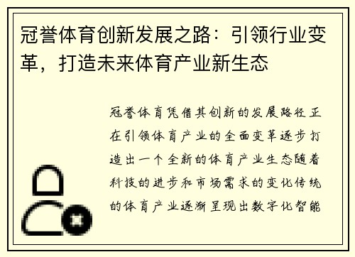 冠誉体育凭借其创新的发展路径,正在引领体育产业的全面变革,逐步打造出一个全新的体育产业生态。随着科技的进步和市场需求的变化,传统的体育产业逐渐呈现出数字化、智能化、全球化的趋势。冠誉体育在这个背景下,积极创新,不断推动行业的变革,致力于打造一个更加高效、互联和智能的体育产业新生态。从技术创新、产业链整合、跨界合作到智能化服务,冠誉体育都在发挥着重要的作用。在本文中,我们将从四个方面详细探讨冠誉体育如何通过创新驱动引领行业变革,推动体育产业向更加多元化、智能化的方向发展。