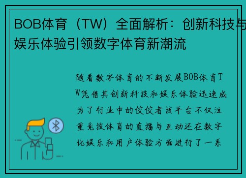 随着数字体育的不断发展,BOB体育(TW)凭借其创新科技和娱乐体验,迅速成为了行业中的佼佼者。该平台不仅注重竞技体育的直播与互动,还在数字化娱乐和用户体验方面进行了一系列突破。通过大数据分析、虚拟现实技术(VR)以及人工智能(AI)的应用,BOB体育(TW)为用户提供了前所未有的体育娱乐体验。本文将从四个方面对BOB体育(TW)进行全面解析,分别是创新科技的应用、数字娱乐体验的提升、用户互动与社交功能的打造以及未来发展趋势的展望,展示BOB体育如何引领数字体育的新潮流。